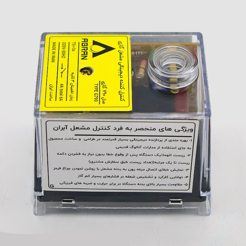 رله کنترل شعله G790 یکی از کنترلرهای پیشرفته جهت کنترل مشعلهای دوگانهسوز (گاز و گازوئیل) است که با بدنهای مقاوم ازپلیکربنات نشکن و نسوز ساخته شده است.این رله بهصورت کامل الکترونیکی بوده و دارای یک چراغ LED راهنما و دکمه ریست در قسمت بالایی دستگاه است که کاربری آسان و تشخیص سریع وضعیت عملکرد را فراهم میسازد.رله G790 برای کنترل ایمن فرآیند احتراق طراحی شده و از دقت و پایداری بالایی برخوردار است.